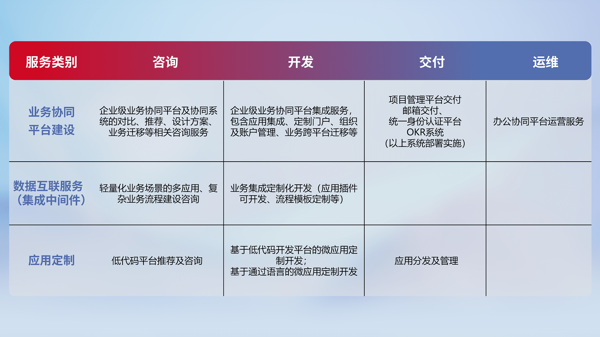 针对钉钉、、、企微、、、、IDaas等平台级产品提供产品的规划、、、、方案、、交付、、、定制化开发等服务,,,实现如统一协同办公、、、智能客户服务、、、、混合会议管理、、智能数据查询、、、、等业务场景,,,,实现数字化转型。。。