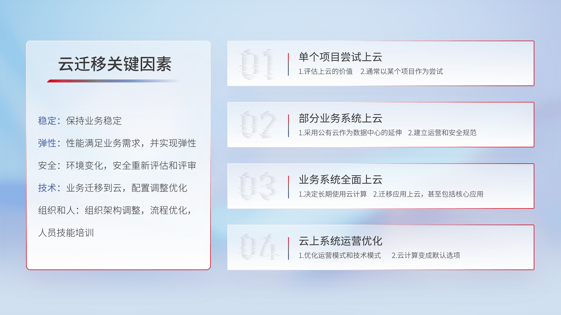 结合实际业务,,,从规划设计、、、、云平台选型、、云原生改造、、、数据迁移、、、集成交付,,,迁移全过程为客户识别最佳上云路径,,,做好风险识别管理,,,,设计网络架构、、身份权限、、、、安全审计合规、、操作审计、、日志审计、、监控告警策略、、多站点容灾设计等,,,,对云上基础设施进行整体规划,,提升IT治理水平,,,以满足弹性、、、高可用、、高性能的需求。。。
