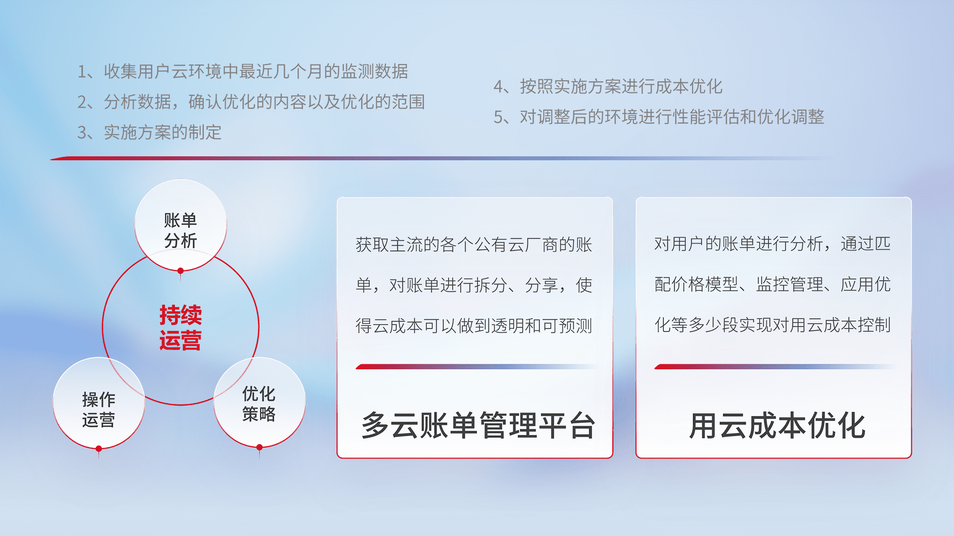 通过多云纳管,,,以统一的资源数据模型把客户的云资源进行抽象和封装,,,,进而实现对多云资源的统一操作,,,保障云资源管理的可靠性、、、稳定性与可用性。。。量身定制化运维内容,,,,配置、、、、开发运维、、、补丁管理、、、备份、、、、监控、、、、认证和访问管理、、、、审计和日常巡检等,,保障在用云过程中的可靠度,,,,稳定度以及高可用率。。。